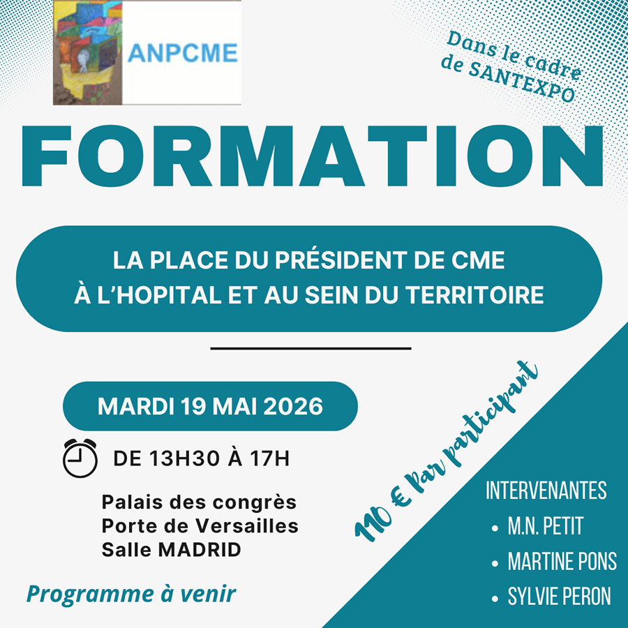Mardi 19 mai 2026 de 13h30 à 17h.Au Palais des congrès, porte de Versailles, Paris. Intervenantes : M.N. Petit Martine Pons Sylvie Peron Bulletin d’inscription à télécharger : formation ANPCME mai 2026Télécharger Ajouter à vos calendriers : Google Outlook Yahoo Étiquettes CMEformation mar mai 19 mar mai 19 Voir notre agenda